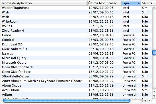 Remover os aplicativos incompatíveis: Ainda há em circulação muitos aplicativos feitos na época em que os processadores dos Macs eram PowerPC, que se encerrou na década passada. Até o Snow Leopard eles eram mantidos compatíveis por meio de um sistema da Apple chamado Rosetta, mas no Lion, a princípio, o Rosetta não será disponibilizado. Para descobrir se você tem algum aplicativo PowerPC instalado, você precisa clicar no menu Maçã e depois em Sobre este Mac, em Mais informações e no item Aplicativos (na lista à esquerda na tela). À direita vai aparecer uma lista com todos os seus aplicativos instalados, e na coluna “Tipo” (ou “Kind”, se estiver em inglês) você deve procurar por “PowerPC”. Como você pode ver na imagem acima, eu tenho 9 instalados, mas vou praticar o desapego em relação a todos eles antes de iniciar o upgrade ;-) A lista de compatibilidade do RoaringApps também vai me ajudar a identificar outros casos de aplicativos para os quais terei que procurar uma alternativa.