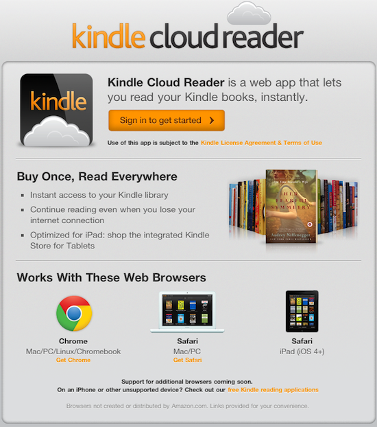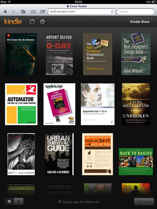 Eis que na madrugada de hoje foi disponibilizado o Kindle Cloud Reader, que funciona diretamente no navegador (incluindo o do iPad) e dá acesso a todos os livros da sua biblioteca do Kindle – e, apesar de ser uma aplicação web, permite também ler offline, ou quando a conexão fica indisponível (ele faz download de cópia local dos livros que você abriu recentemente, e também permite que você “force” o download de qualquer título).