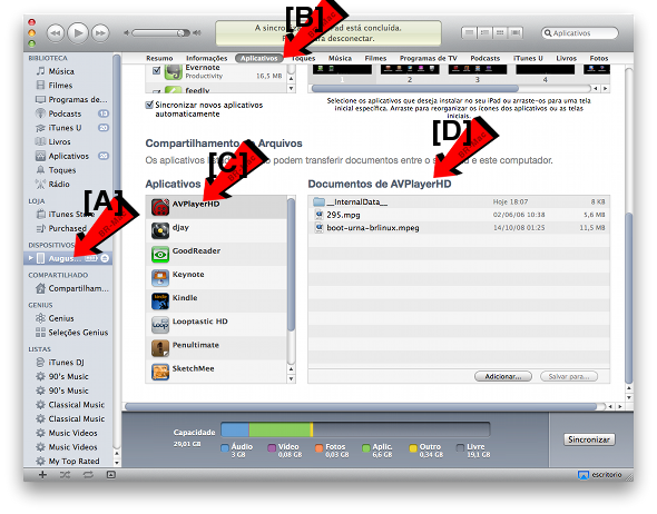 - rola a tela até aparecer o Compartilhamento de Arquivos, no qual o usuário seleciona o AVPlayerHD [C] (que já deve ter sido instalado no iPad anteriormente, claro)